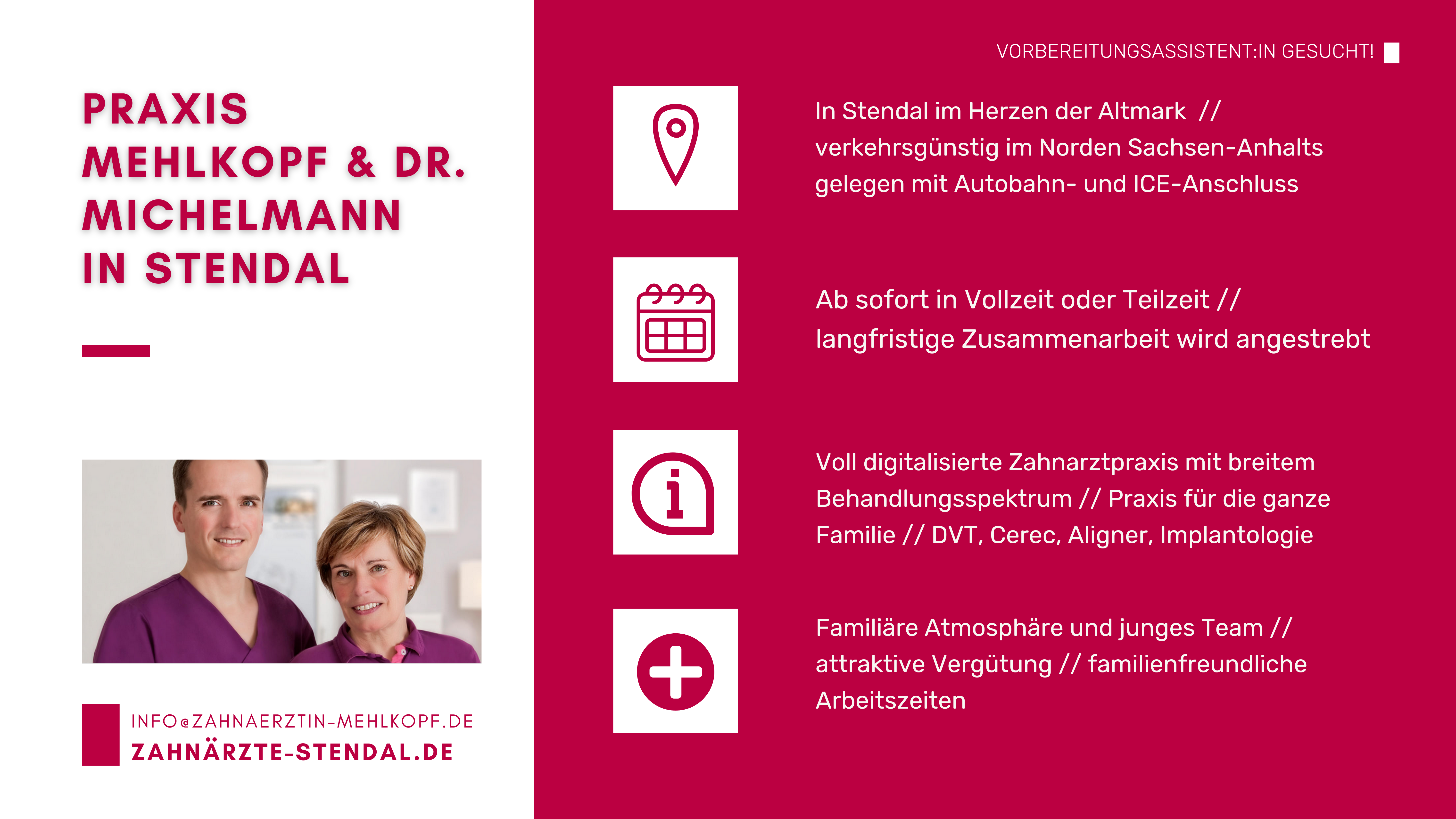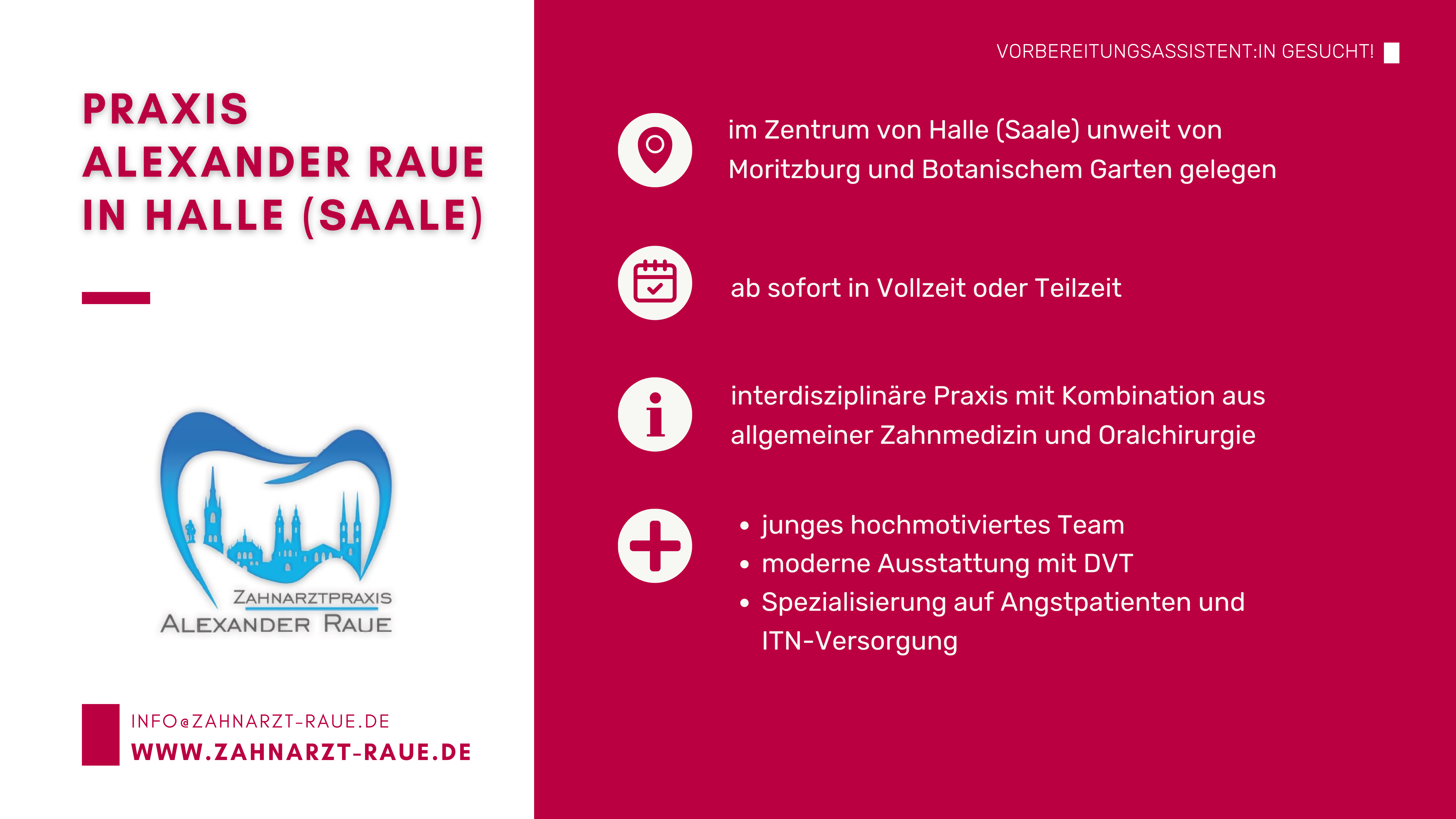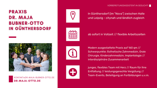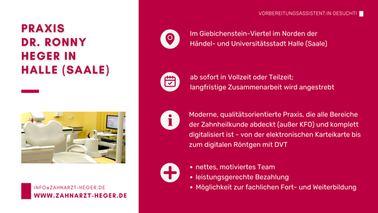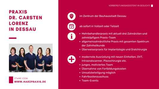 Sie stehen am Beginn Ihrer zahnärztlichen Laufbahn und suchen eine Praxis, in der Sie Ihre Vorbereitungsassistenzzeit absolvieren können? Auf dieser Seite finden Sie aktuelle Stellenanzeigen sowie Kurzprofile von Zahnarztpraxen in ganz Sachsen-Anhalt, die engagierte Vorbereitungsassistentinnen und Vorbereitungsassistenten suchen.