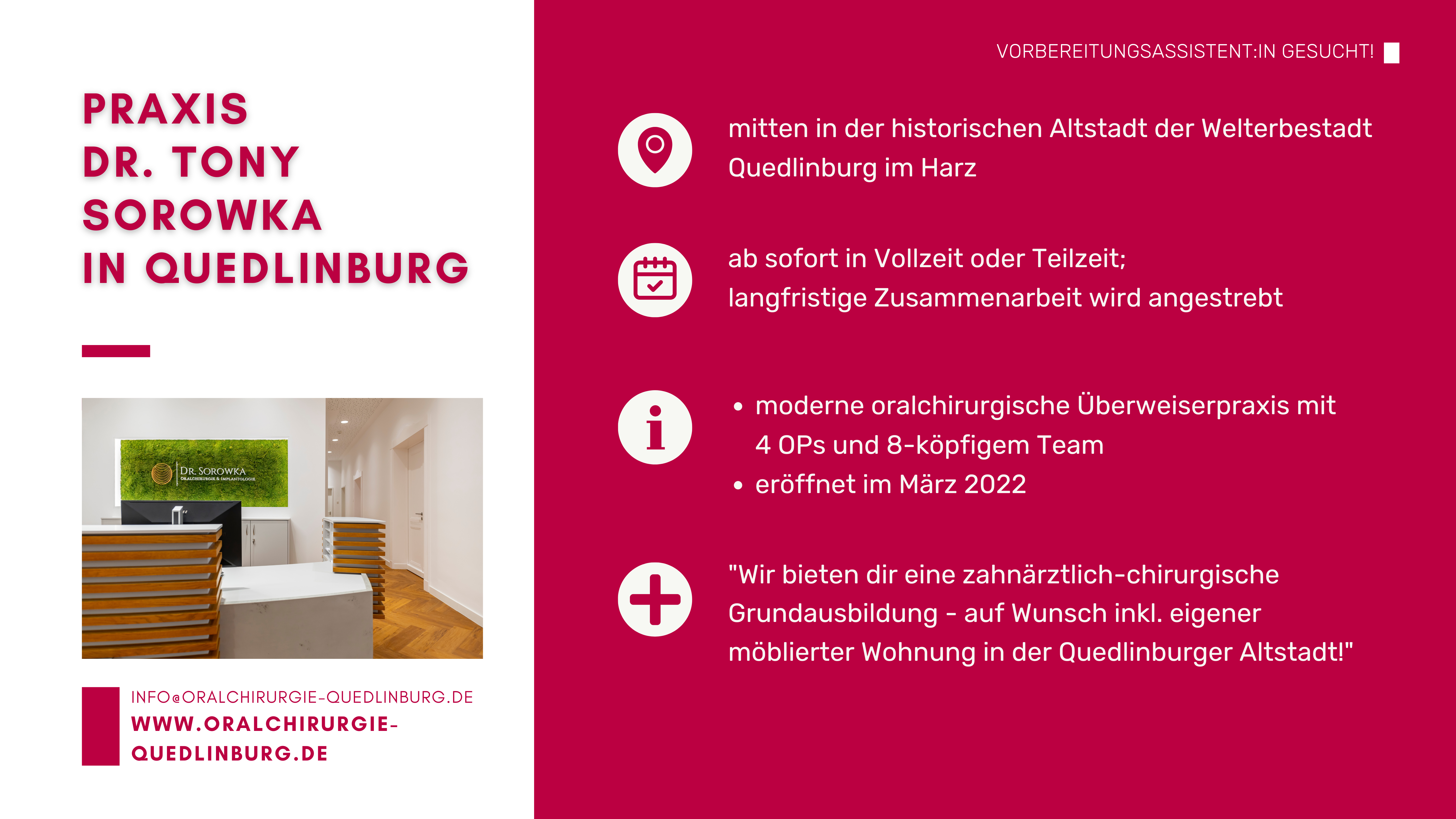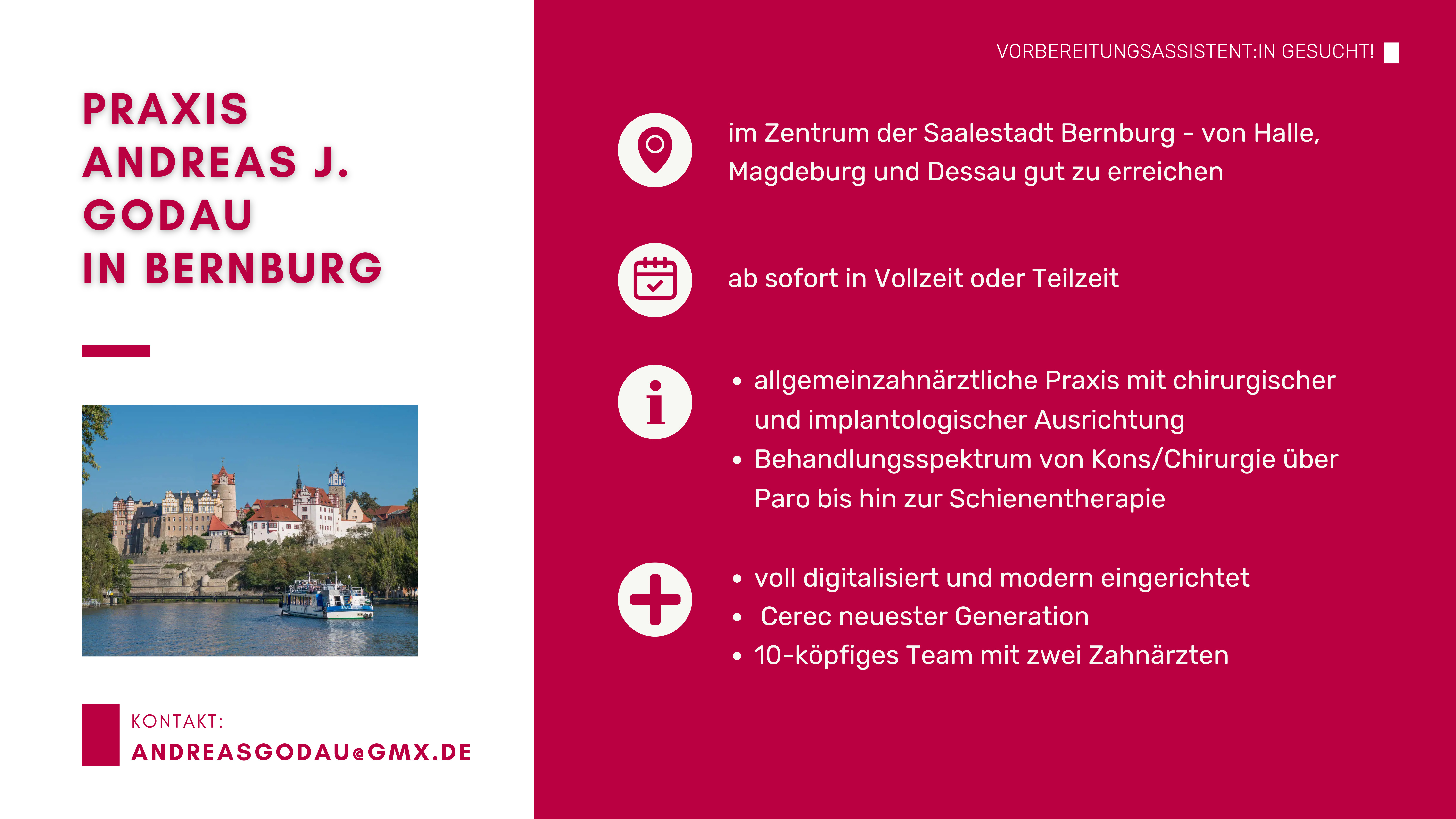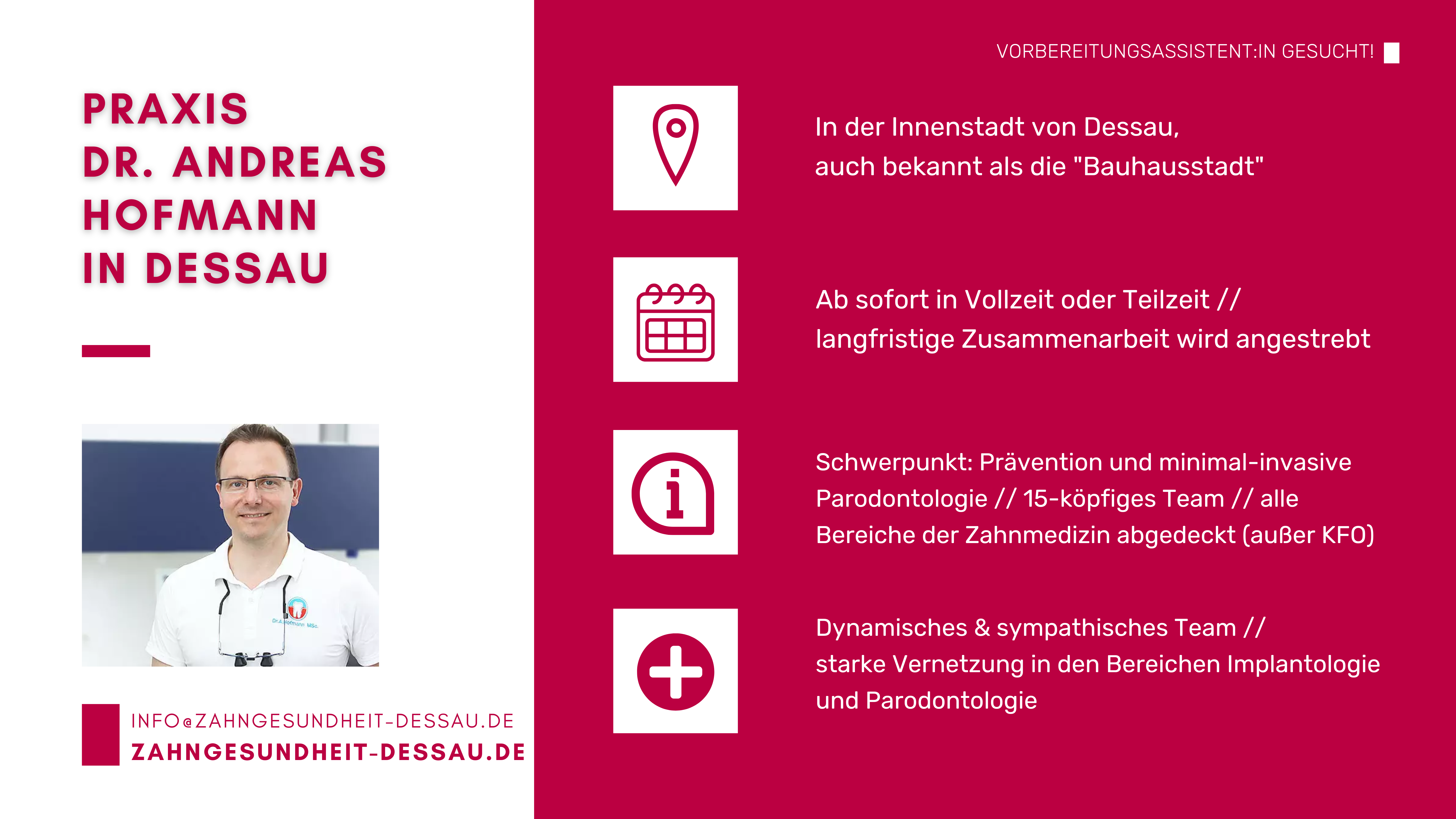 Sie stehen am Beginn Ihrer zahnärztlichen Laufbahn und suchen eine Praxis, in der Sie Ihre Vorbereitungsassistenzzeit absolvieren können? Auf dieser Seite finden Sie aktuelle Stellenanzeigen sowie Kurzprofile von Zahnarztpraxen in ganz Sachsen-Anhalt, die engagierte Vorbereitungsassistentinnen und Vorbereitungsassistenten suchen.