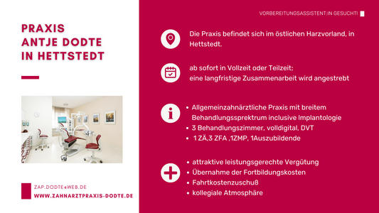 Sie stehen am Beginn Ihrer zahnärztlichen Laufbahn und suchen eine Praxis, in der Sie Ihre Vorbereitungsassistenzzeit absolvieren können? Auf dieser Seite finden Sie aktuelle Stellenanzeigen sowie Kurzprofile von Zahnarztpraxen in ganz Sachsen-Anhalt, die engagierte Vorbereitungsassistentinnen und Vorbereitungsassistenten suchen.